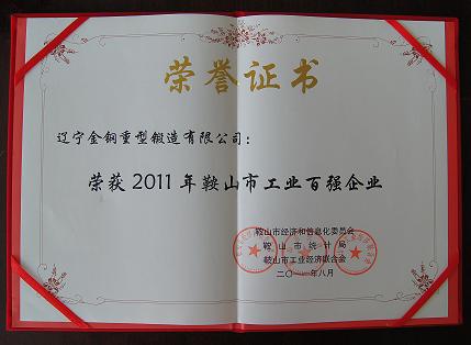 2011年8月31日下午在鞍山市東山賓館,鞍山裝備制造業協會受鞍山市經信委的委托向鞍山市裝備制造業的32家企業頒發了2011年鞍山工業百強企業榮譽證書,百強企業活動是由鞍山市經濟和信息委員會、鞍山市統計局、鞍山市工業經濟聯合會共同評審的。我公司位列第72位。陳董事長在會上做了經驗介紹。(下圖為我公司獲得的榮譽證書)